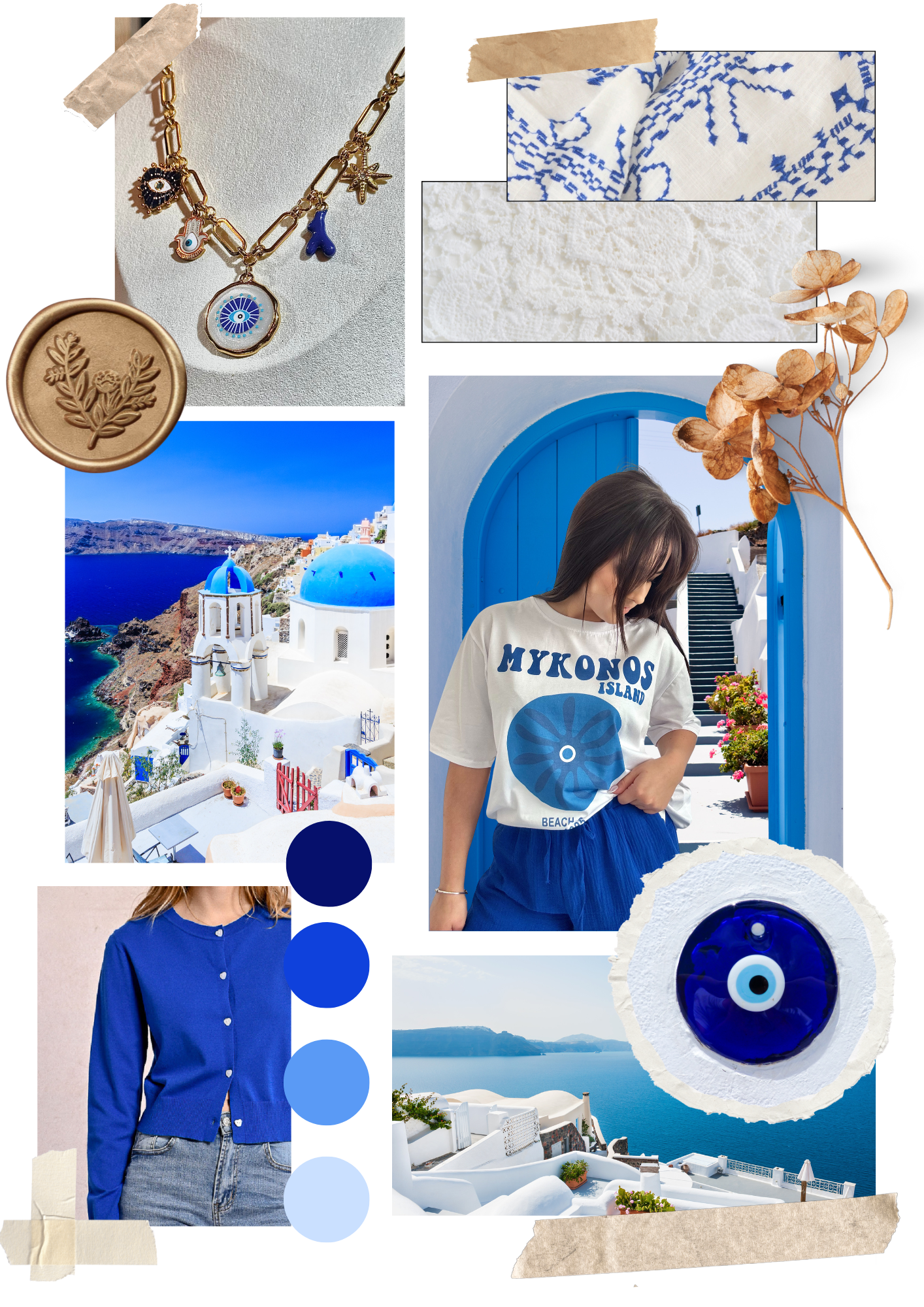 La collection Mykonos s'inspire de l'énergie lumineuse de l'ile grecque, entre blanc éclatant, bleu profond et touches d'or.